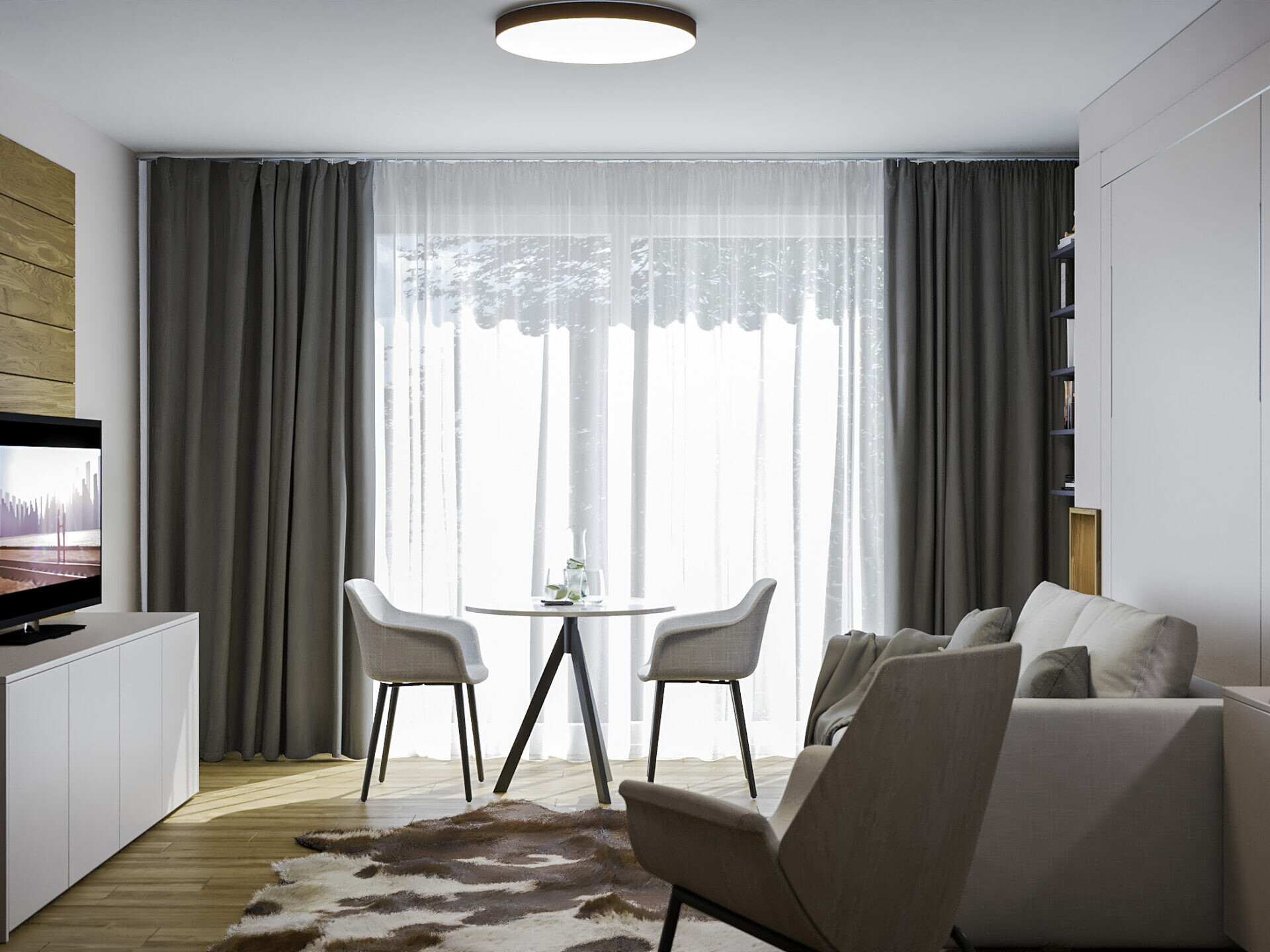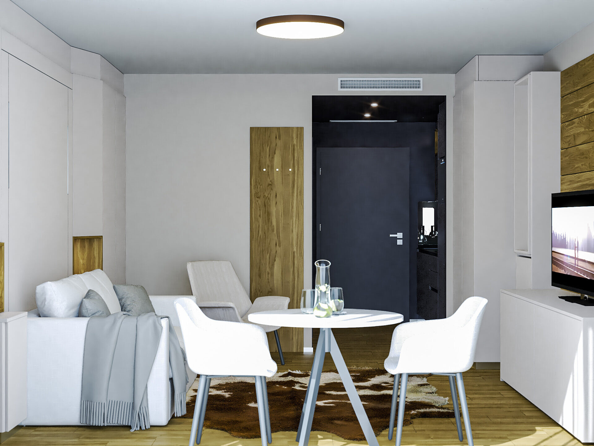 FORTEZZA home ha 2 tipologie di appartamento. 42 mq con balcone a sud. 45m2 completamente ammobiliati e climatizzati.
