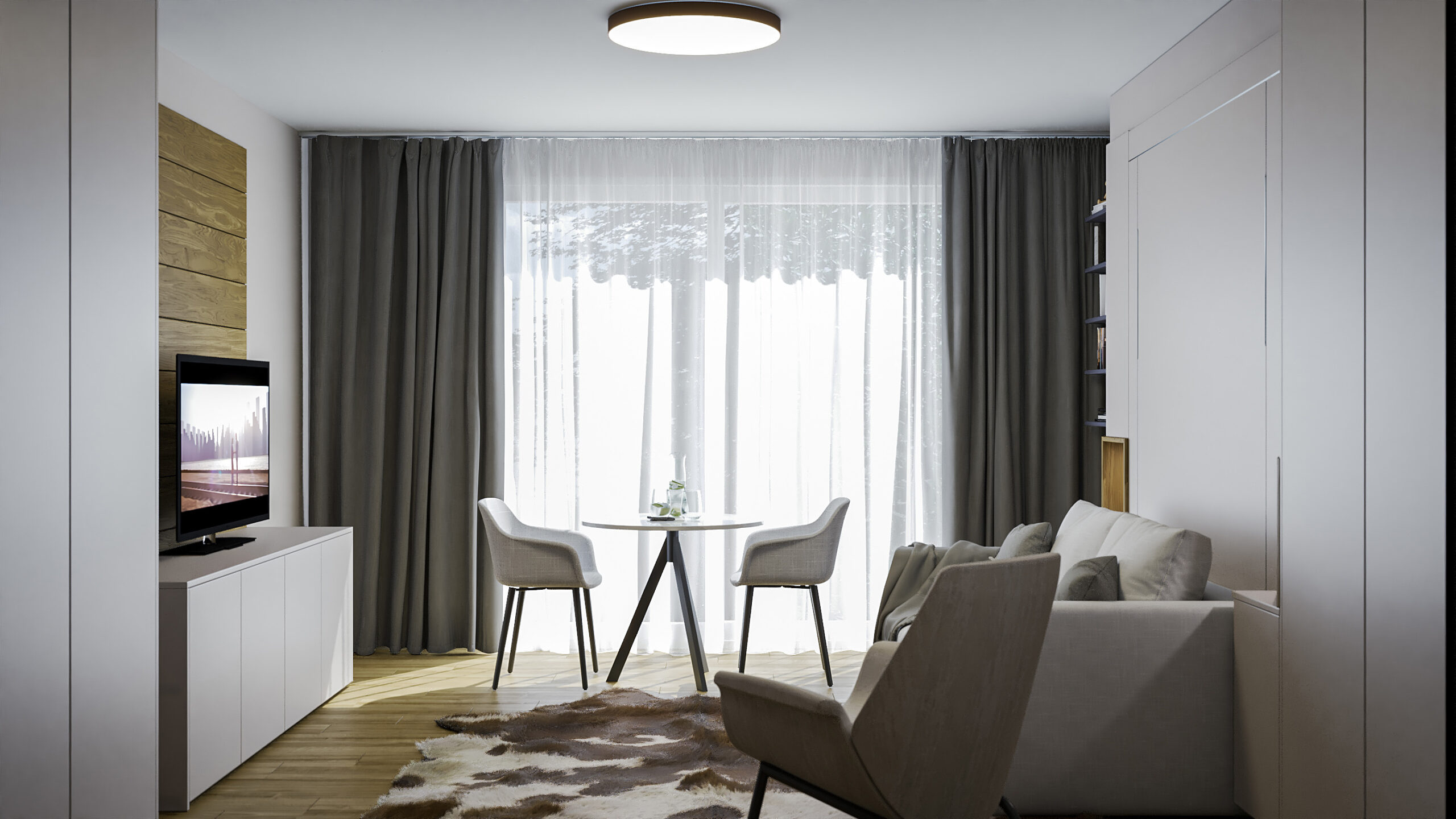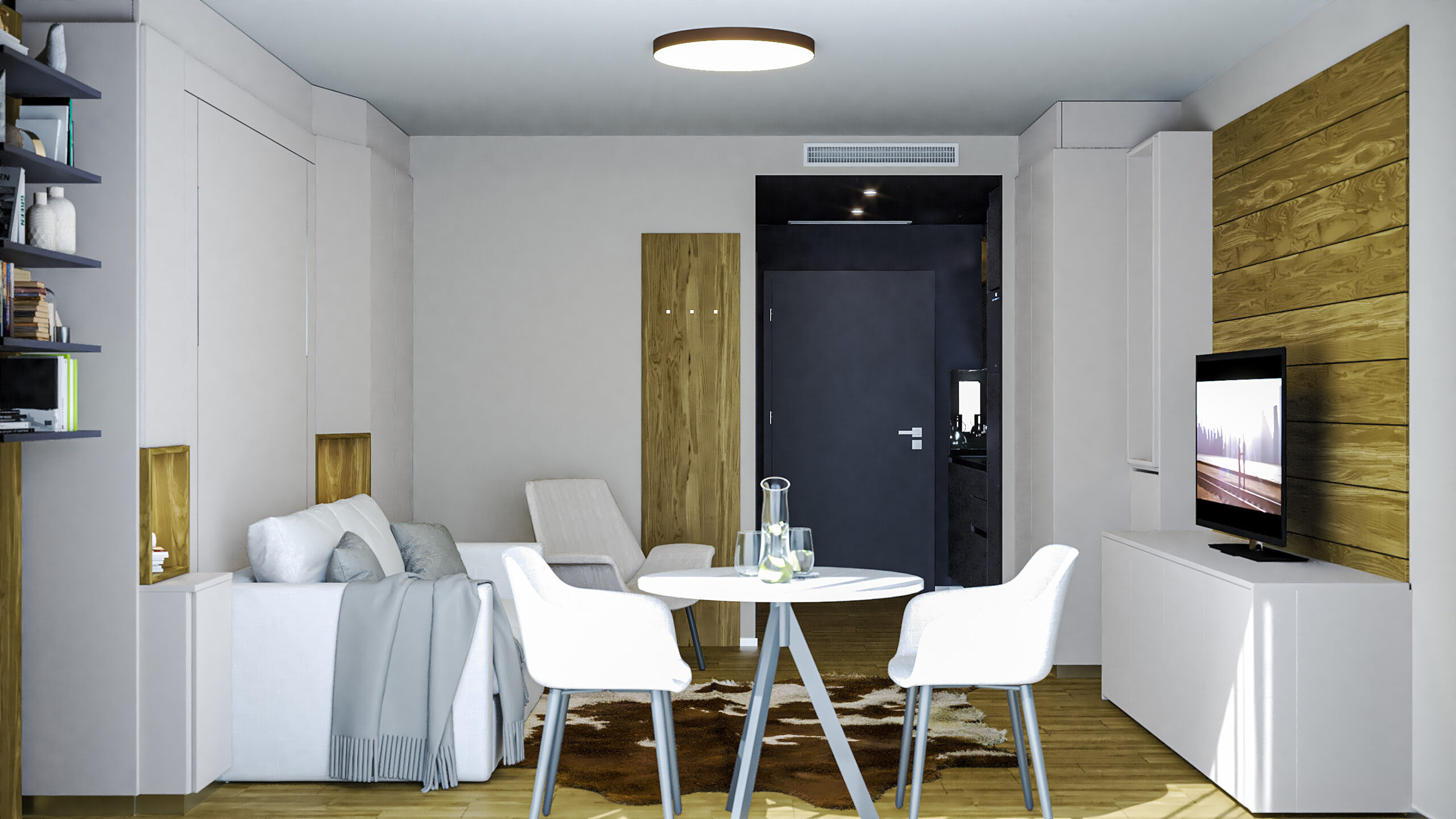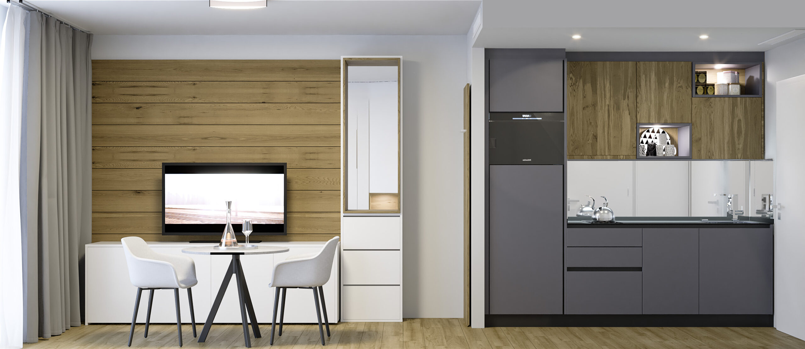 FORTEZZA home ha 2 tipologie di appartamento. 42 mq con balcone a sud. 45m2 completamente ammobiliati e climatizzati.